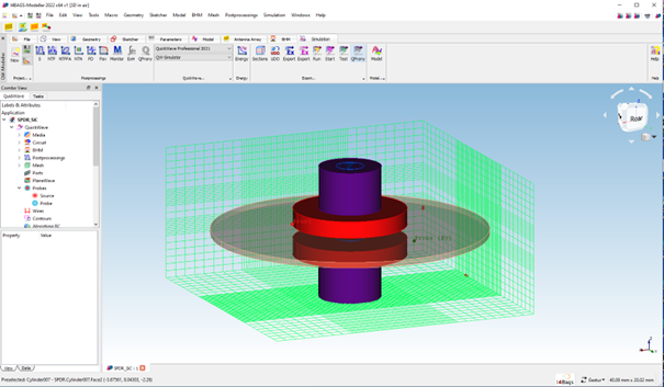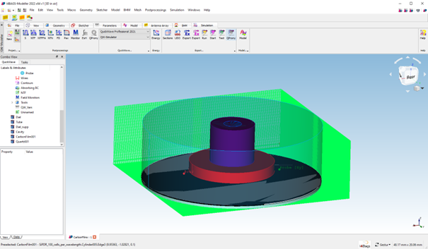 A comprehensive 3D model of an SPDR (Split Post Dielectric Resonator) with a Silicon Carbide (SiC) sample inside was created. The model allows full manipulation of resonator model, sample and simulation parameters. A standard example is shown below.