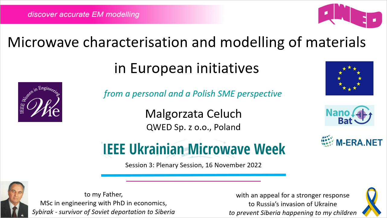 It was therefore with honour and pleasure that QWED contributed to the Week. Dr. Malgorzata Celuch served as member of the Techncial Programme Committee. She also gave an invited lecture on Microwave characterisation and modelling of materials in European initiatives. Last but not least, greatly supported by the NanoBat project consortium and IEEE Women in Engineering (and specifically the speakers of a sister event held at MIKON-MRW in Gdansk in September 2022), she organised a Women in Engineering Meeting, where professional and personal experiences were shared in support of the Ukrainian (and specifically female) researchers.