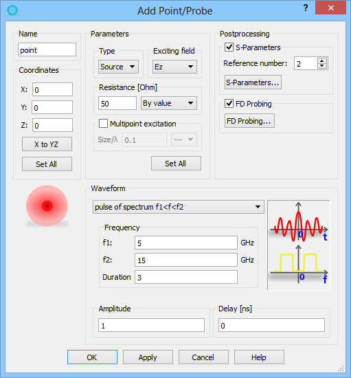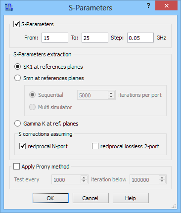 Time-domain data, such as time evolution of fields or currents and voltages at lumped ports, can be accessed in QW-Simulator at any time and any location within the structure. Data in the frequency domain, such as S-Parameters, are produced by means of the Fourier transform, which must be performed on selected time-domain quantities throughout the simulation. Additional memory must also be allocated at the beginning of the simulation process. For these reasons, the user must indicate the required frequency domain results before starting QW-Simulator.