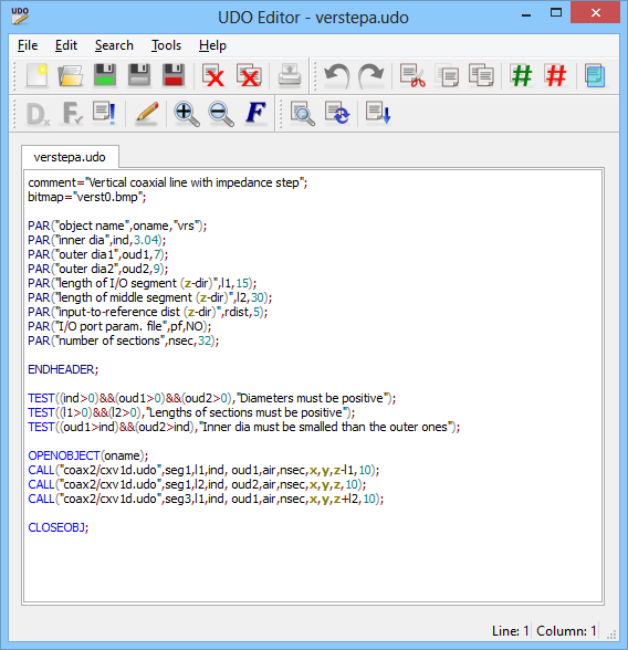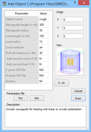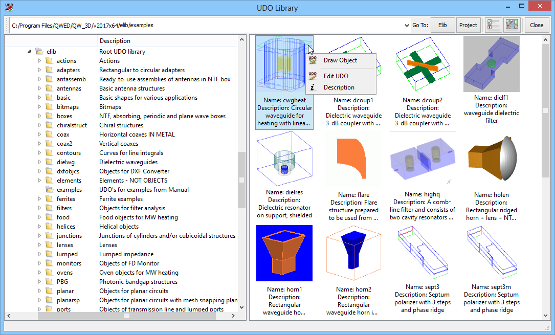 QW-Editor includes QW-ObjectGenerator. QW-ObjectGenerator is essentially an interpreter for source scripts provided by QWED in a form of library UDOs or prepared by the user in a specially developed UDO (User Defined Object) language. These source programs are stored in files with *.udo extension. The UDO language is simple and yet gives the user the possibility to create his own arbitrarily complicated parametric objects, best suited for his particular requirements.