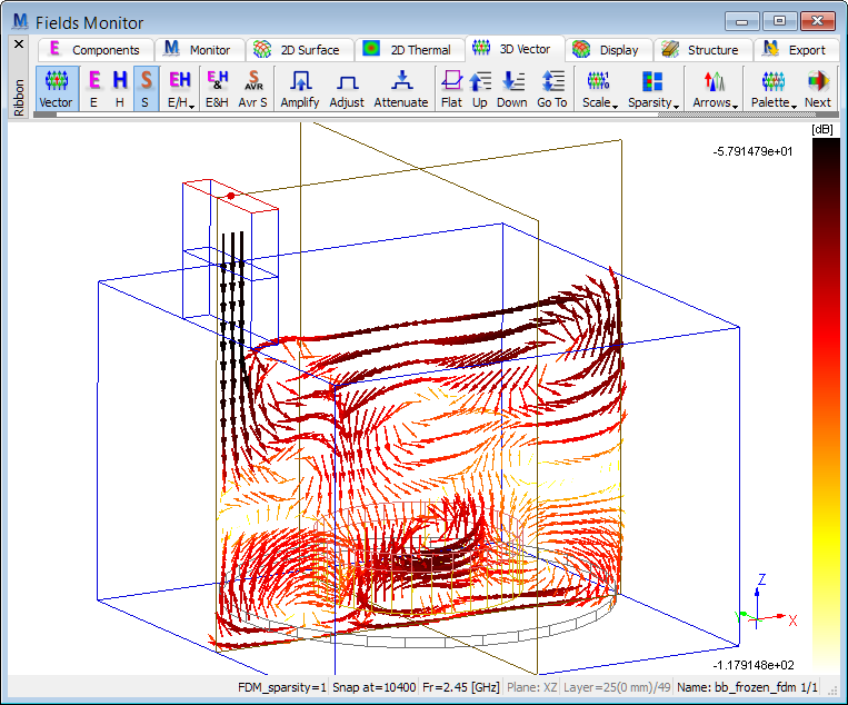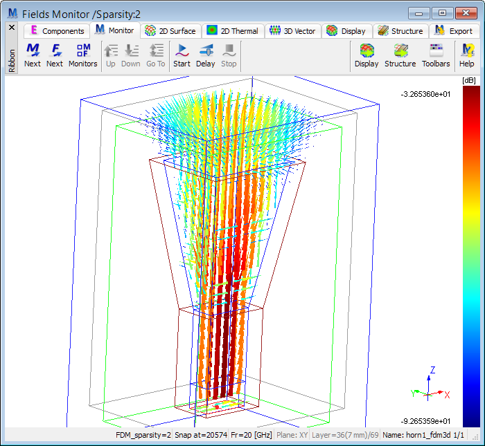 The Fields Monitor window allows dynamic monitoring of field distributions at selected frequencies from data extracted by Fourier transforming of the results of simulation obtained with pulse excitation.