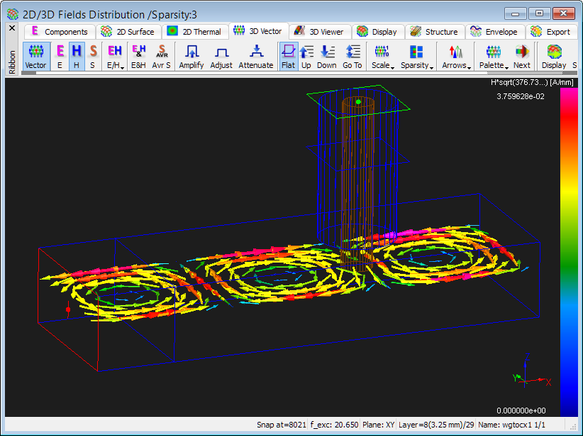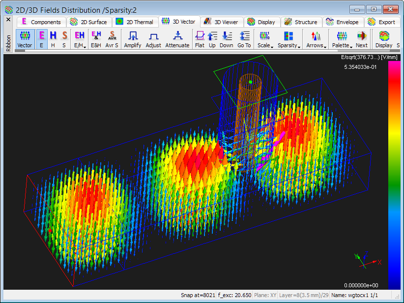 The 2D/3D Fields Distribution window allows dynamic monitoring of field distributions during time-domain simulations with any kind of excitation. For such monitoring no special arrangements are needed before launching the simulation. The user can decide at any time of the simulation: which fields are of interest, what kind of displays he prefers, and how many windows he wants to open.