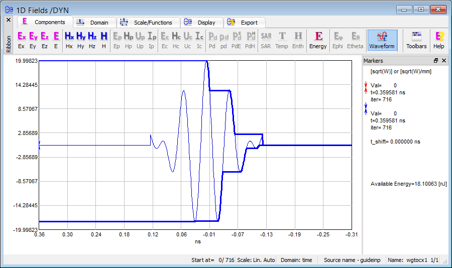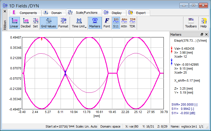 The 1D Fields window allows watching variety of electromagnetic quantities: