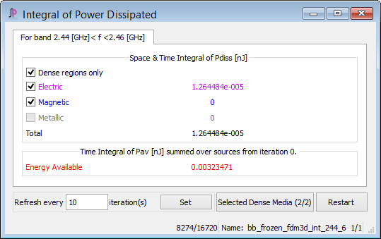 Integral of Power Dissipated window presents the results of space and time integration of power dissipated and time integration of power available from the source.