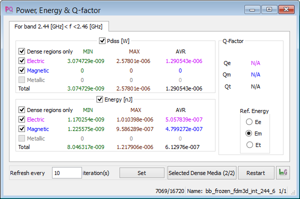 Power, Energy & Q-factor window presents the results of dissipated power and stored energy, as well as Q-factors extracted from the ratio of these quantities.