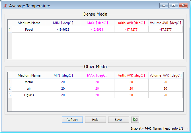 The Average Temperature window presents the values of average temperature (in Celsius degrees) in dense media and non-dense media. The Average Temperature window is available for viewing only if QW-Simulator works in BHM regime.