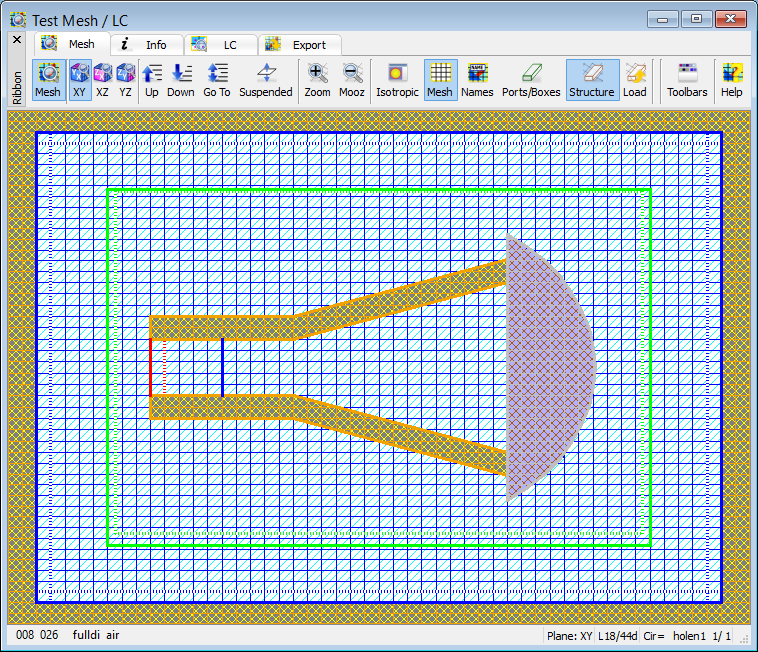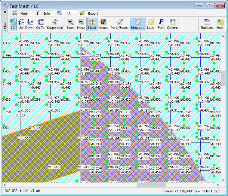 The Test Mesh window allows watching and testing the effective FDTD mesh grid and coefficients used in FDTD simulation. A set of testing tools allow checking the position and dimensions of different simulation objects like, e.g. transmission line ports, MUR wall/box, NTF box, etc.